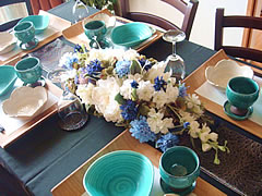 2008年4月は春の和食メニューパッと目を惹く鮮やかなコバルトブルーの器がとても涼しげな印象の、初夏を先取りしたテーブルコーディネイト。