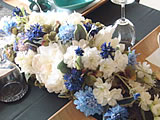 真っ白い大輪のしゃくやくをメインに、食器のコバルトブルーと同じブルー系の矢車草を組み合わせて。 涼しげで初夏らしいアレンジメントです。 |