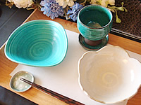 キレイなコバルトブルーの器と、スープを入れた陶器のワイングラスは自由が丘「karako」で購入。 一見難しそうな色ですが、意外とどんなお料理にも合わせやすいです。 箸置きは、小花の絵が描いてある豆皿。 |