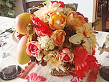 オレンジやピンクオレンジのチューリップにバラ、そしてアイボリーのダリアやアジサイを合わせ、刺し色にはグリーンのアジサイを。白と黄色の蝶にマンゴーをプラスし、花器はディッシュプレートと同じ籐の物で統一感を出します。 |